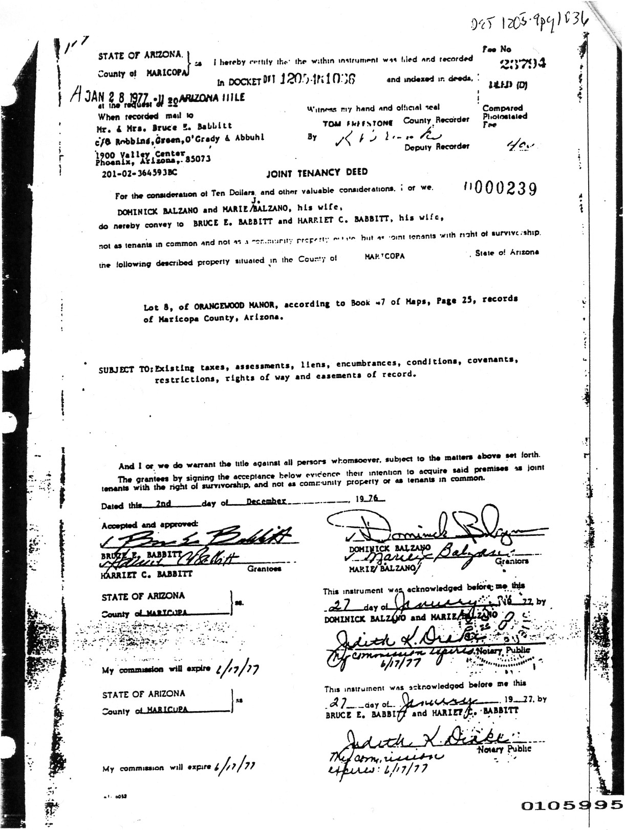 The first is a copy of the January 1977 deed by which then Arizona Attorney General Bruce Babbitt acquired a house in Phoenix from Dominick Balzano. At that point Babbitt already had taken charge of the Bolles murder investigation and prosecution. Balzano in turn was among those suspected of complicity in the organized crime theft of gold from Motorola, the “big story” on which Bolles had been working until stopped by the June 1976 car-bombing that killed him.