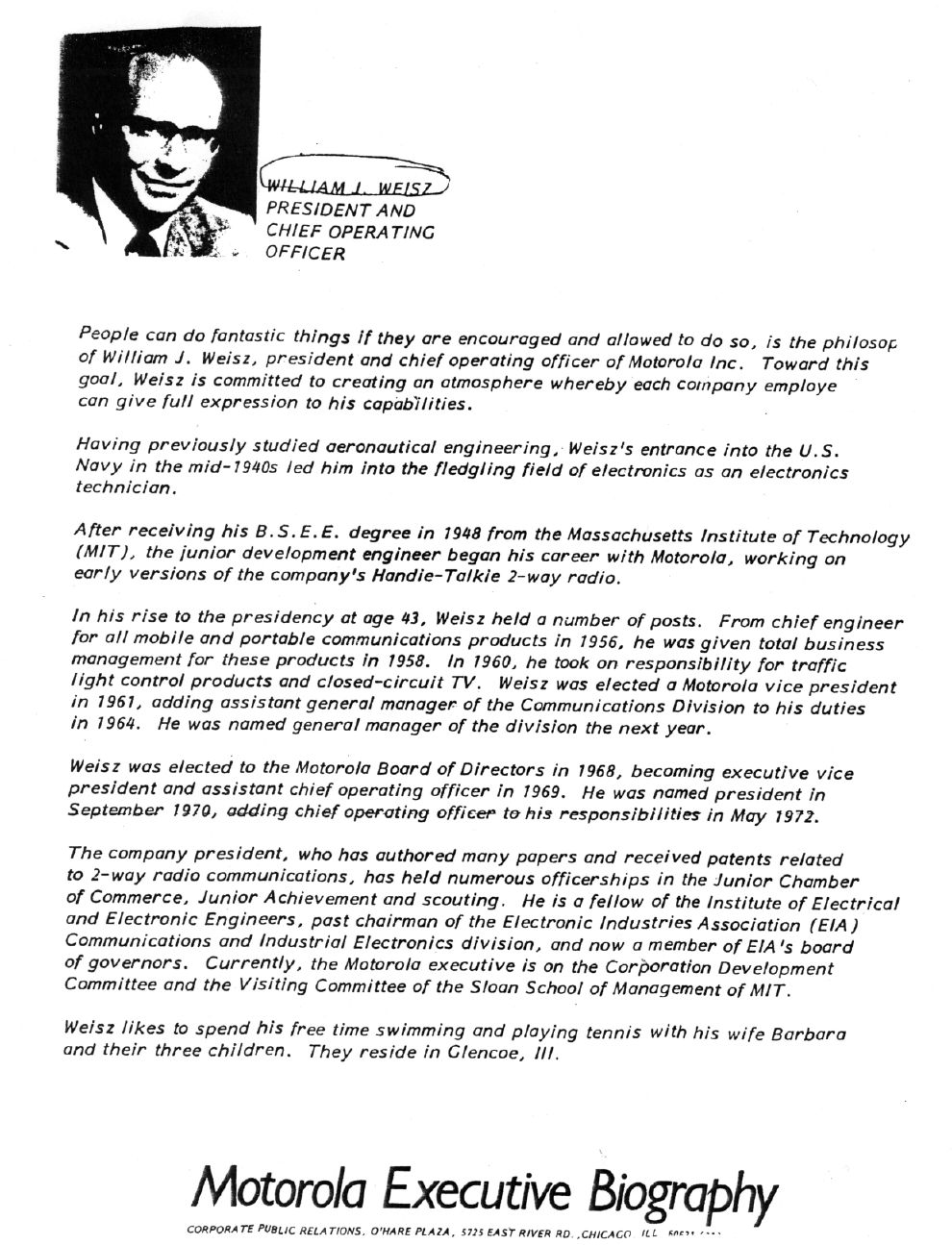The second document is a Motorola press release which effectively confirms the role of William Weisz as corporate president in the critical years leading up to and following the Bolles homicide. During that span Motorola evidently suffered a very sizable mob rip-off of such precious metals without—for some strange reason—ever making a related complaint to law enforcement authorities.
