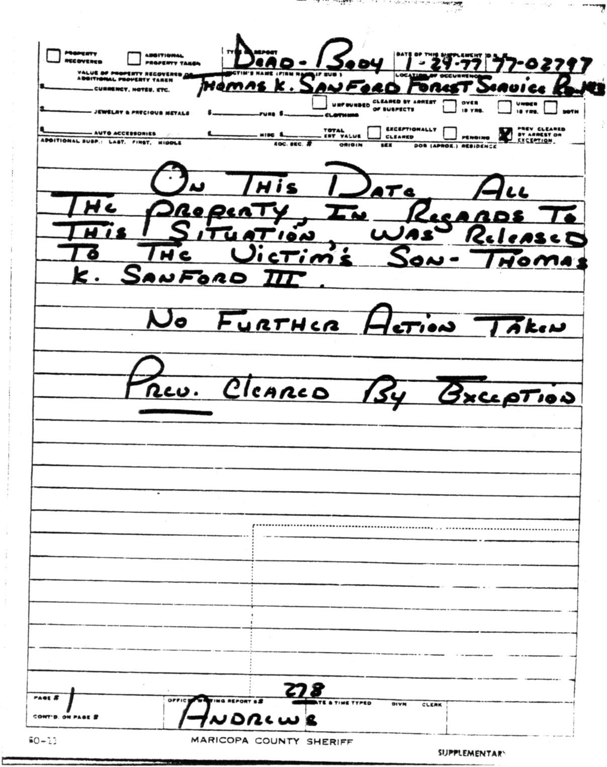 Whatever occurred, by the following day, January 26, 1977, MCSO already had ruled the Sanford case closed—“cleared by exception”—as a “suicide.” (See form at right.) It obviously was a hasty conclusion but one ostensibly supported by the fact that the shotgun belonged to the victim, there were no conspicuous signs of anyone having been with him, there was a half-empty bottle of Jim Beam whiskey in the car, and Sanford’s son Kyle admitted upon family notification that his father could have been upset about leaving the newspaper.