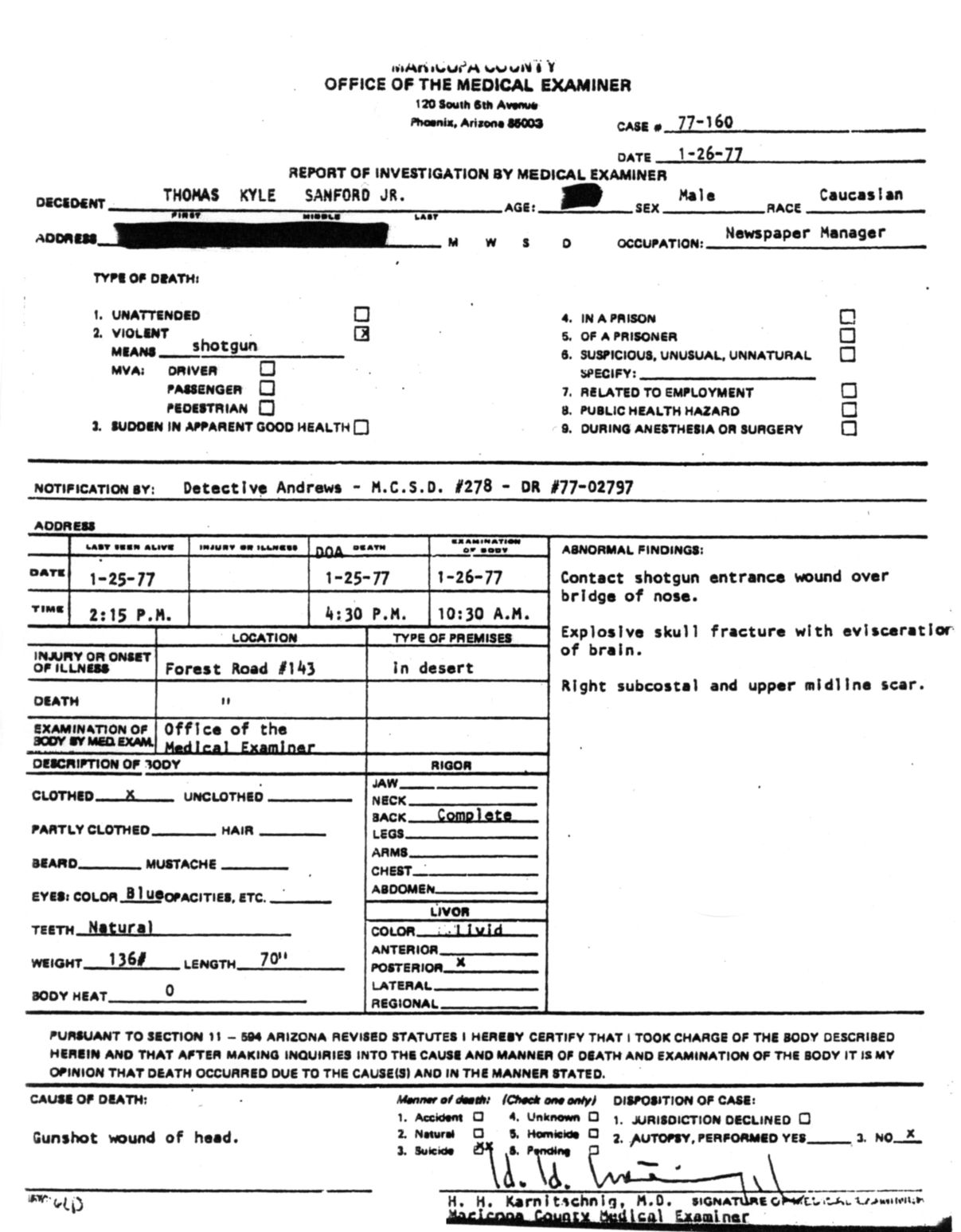 Less than 24 hours after Sanford died, and with an amenable endorsement by Medical Examiner Dr. H.H. Karnitschnig at the time, his death conveniently was determined to have been “self-inflicted.” Based entirely on what little MCSO reported, Dr. K. (as he often was called) also concluded on January 26, 1977, that, “This man had been despondent over losing his job on January 24, 1977. He was found dead in the desert near his car with a shotgun wound of the head. The gun was found between his legs. An opened bottle of whiskey was found in the car.” In other words, Sanford was depressed, got drunk, and killed himself.