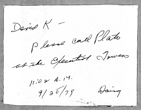 Phone message from Plato Jones to David K. Funk. Click image to see full size.