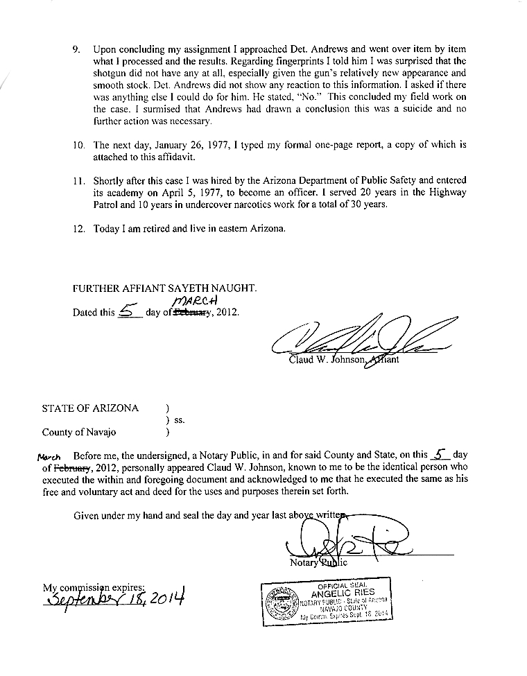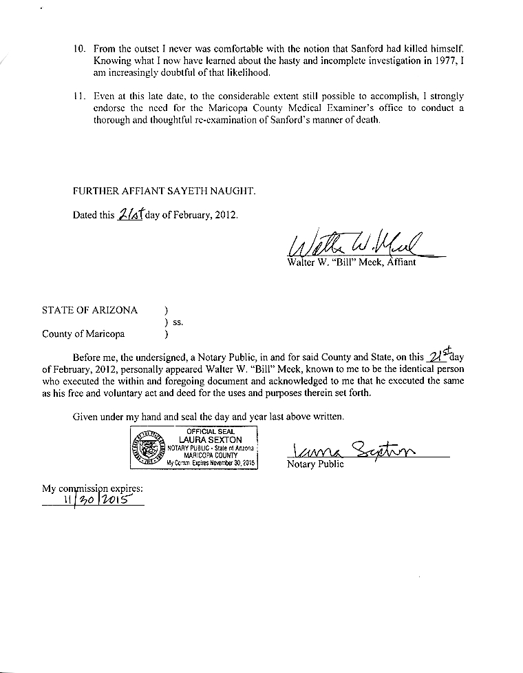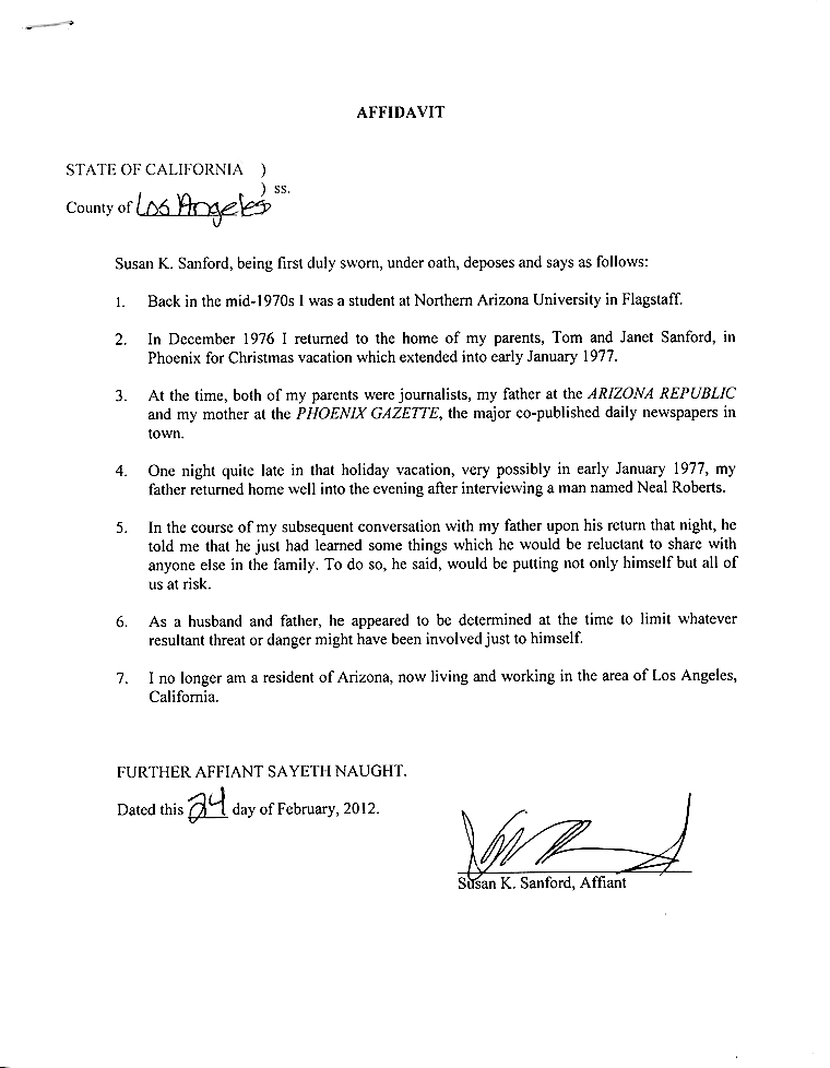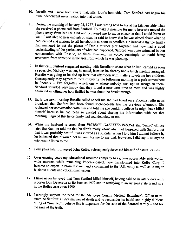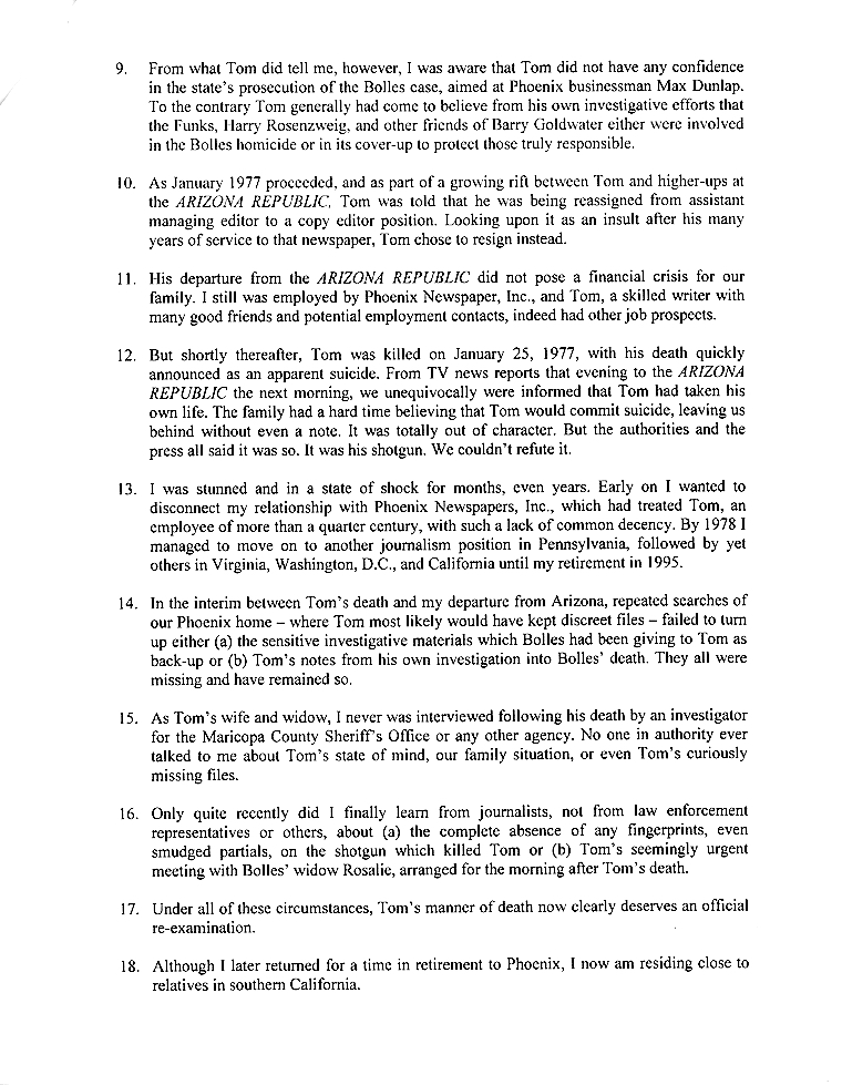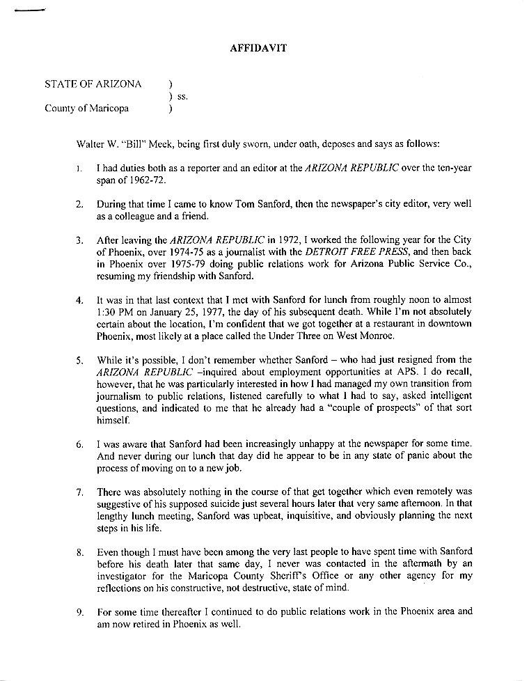 Back in the early months of 2012, I arranged for formal affidavits on the subject of the strange death in January 1977 of ARIZONA REPUBLIC editor Tom Sanford to be completed by (1) his widow Janet Sanford, recently deceased, (2) his daughter Susan Sanford, (3) former journalist and his close friend Bill Meek, (4) Kathy Kolbe, a close friend of the late Don Bolles and his wife Rosalie, and (5) Claude Johnson, a 1977 crime scene technician of the Maricopa County Shireiff’s Office.