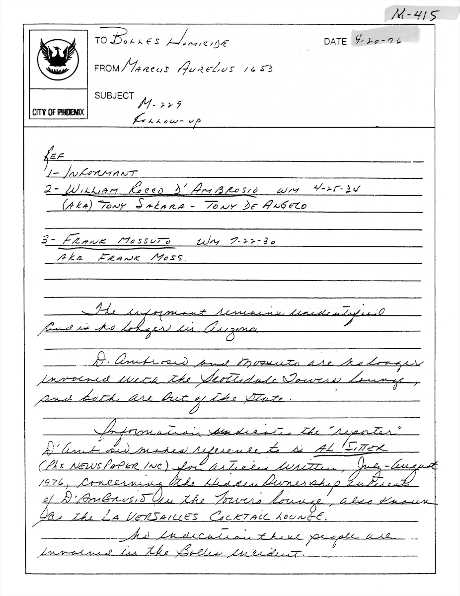 May then identified D’Ambrosio and Mossuto as his bosses at Scottsdale’s La Versailles who had sent him to New Mexico with $500 to purchase some dynamite. According to Rhiel’s hand-written report filed on June 20, 1976, May had heard D’Ambrosio and Mossuto talking about a “reporter” in the context of the dynamite but never heard a name. It was Bolles, however, who explicitly came up in May’s de-briefing by Rhiel. Acknowledging that Adamson and D’Amborsio were “fairly tight,” May even offered an opinion to Rhiel that neither one was “smart enough to do a deal like Bolles” on his own.